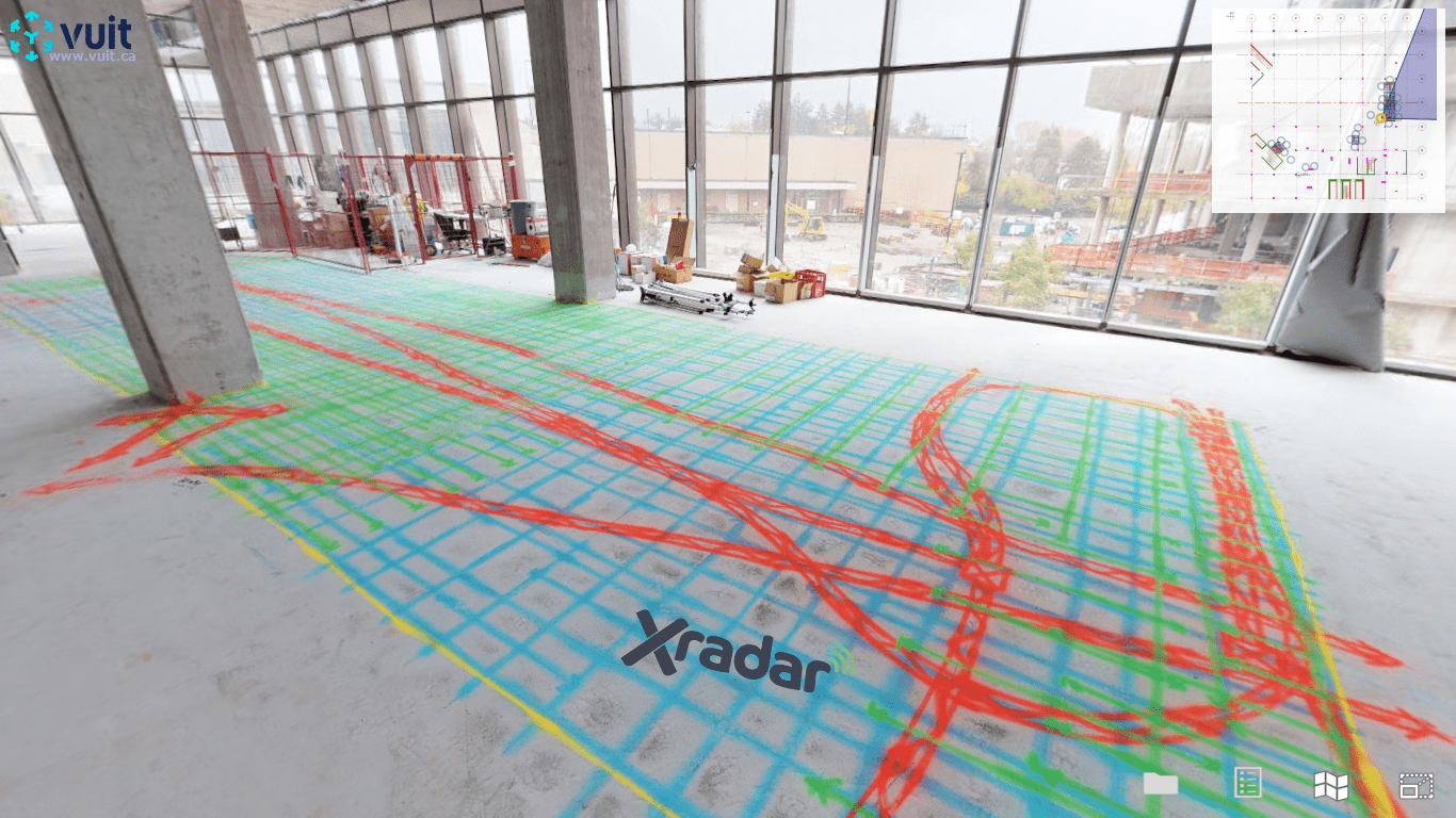 Xradar technology enables the scanning technician to easily differentiate between steel reinforcement, plastic conduits and post-tension cables. All embedded objects are then accurately identified and marked on the ground itself.