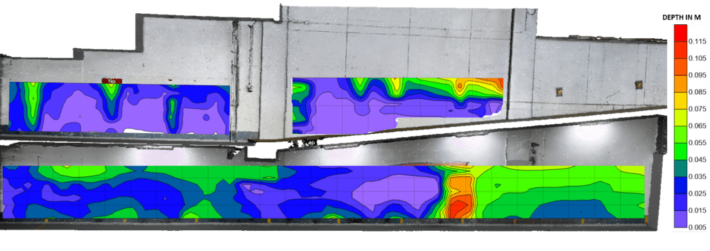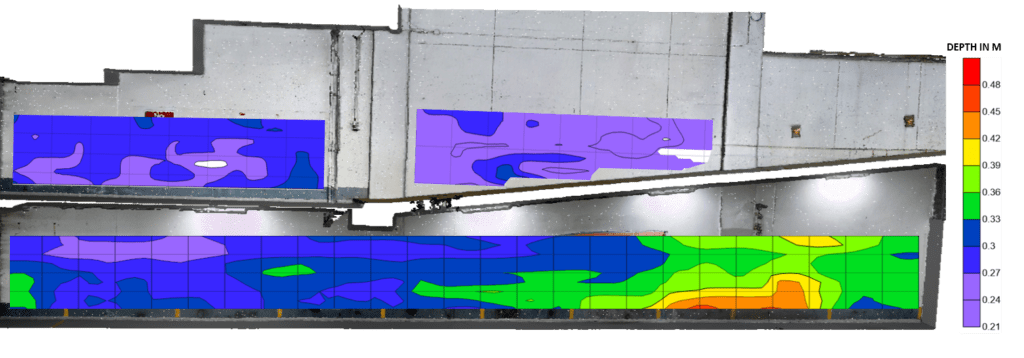 These areas include slabs, beams, columns, and walls. These areas are too large to be surveyed by regular means and often require more detailed reports to showcase accurate data such as carry capacity and thickness, along with reports and drawings of rebar locations, cover measurements, and diameters.