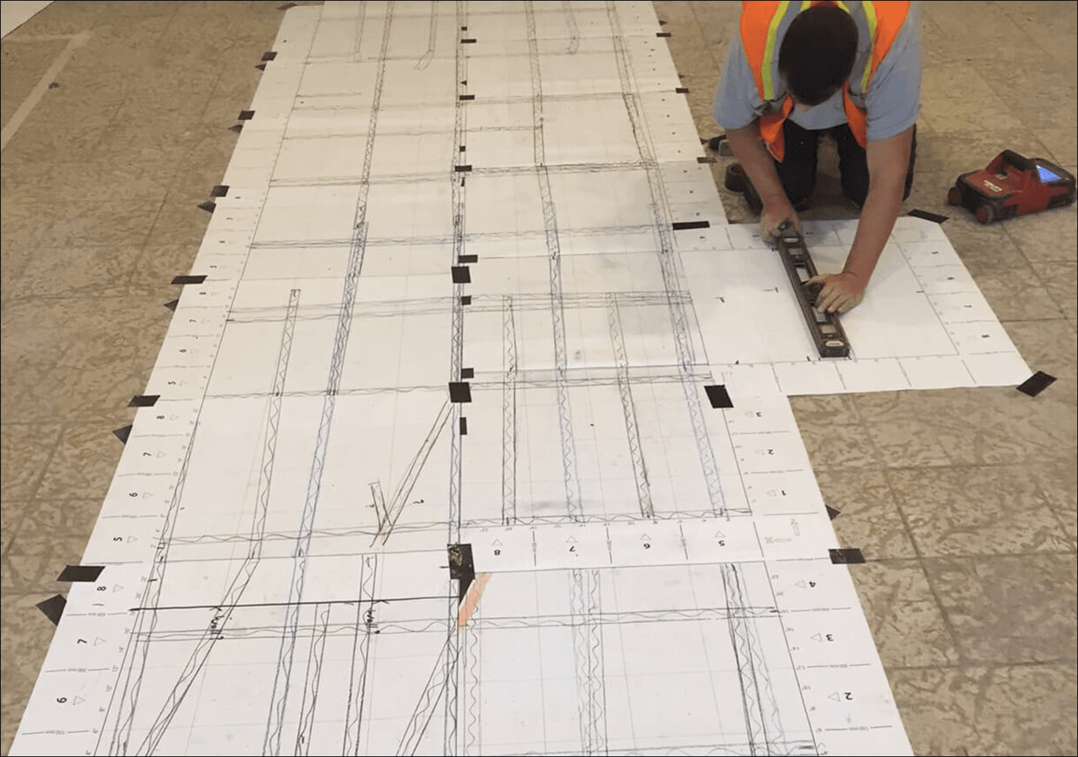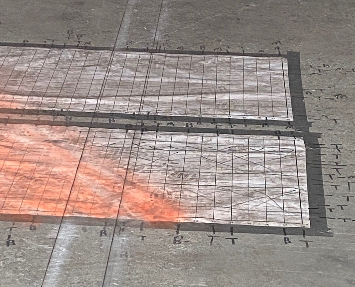 A further limitation to the grid scan is in the transferral of data. Targets are displayed digitally on a screen and need to be transferred to the slab after the grid scan is completed. With the user often marking the targets on the grid paper after the grid scan is completed, there’s risk of inaccuracies, which increases the risk of accidental damage to embedded targets. Furthermore, the markings on paper are not very durable (as highlighted in the picture above), and should the tape holding the grid paper to the slab ever come loose then the whole scan will be unusable. In this case the accurate location of the targets is impossible to be verified without a repeat scan.