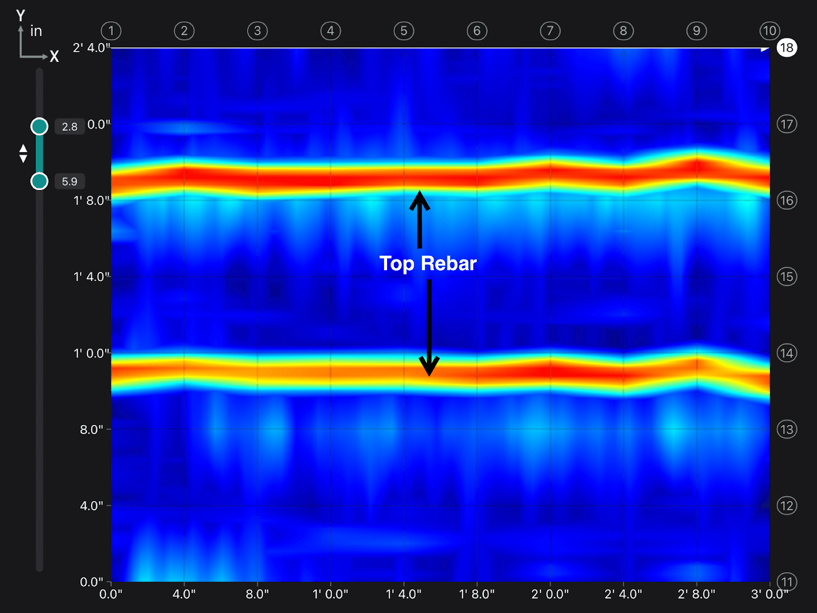 Figure 1 below shows the findings of a 3D grid scan whilst scanning simply the grid lines shown. This shows quite clearly the top rebar, which will have been marked on the grid as a target to avoid.