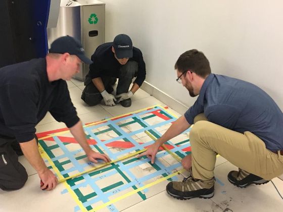 Once granted access to the underside of the structural slab, the crux of the problem comes down to the depth penetration of radar from the underside. If the structural slab can be successfully scanned from the underside, then the process is simple. Scan the topping slab, scan the underside of the structural slab, transfer these marks to the top side of the topping slab for engineer review.