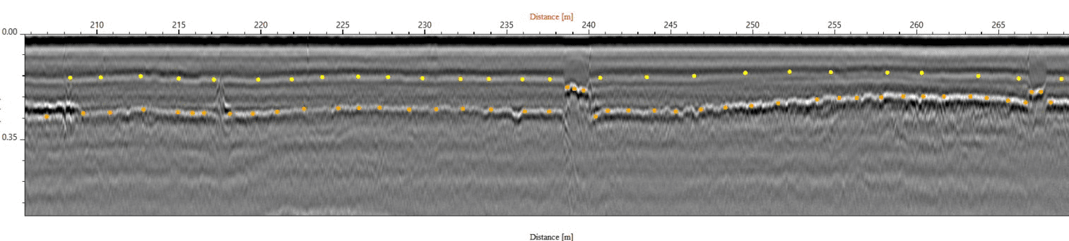 The survey results revealed a prominent layer throughout the data set, interpreted as asphalt. The variations in asphalt thickness were attributed to previous repairs, the addition of new layers, or utility-related work. These findings highlight the dynamic nature of the surveyed locations, influenced by historical maintenance and infrastructure activities.