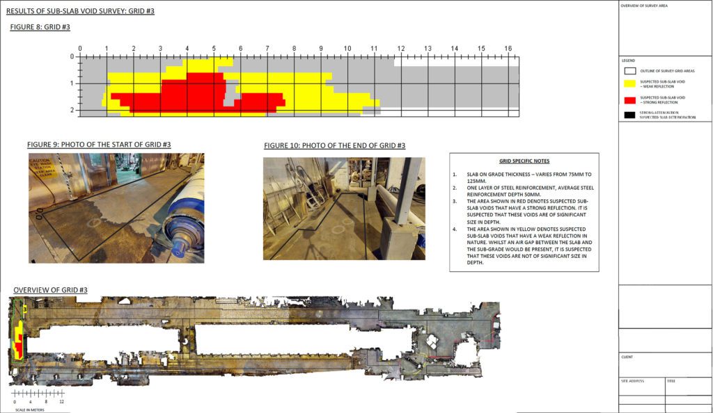 The data was processed and analyzed and voids were identified below the slab in a number of locations. Some areas highlighted showed small air gaps between the concrete slab on grade and the soil beneath, however, sizeable voids were also detected, along with evidence of concrete deterioration.