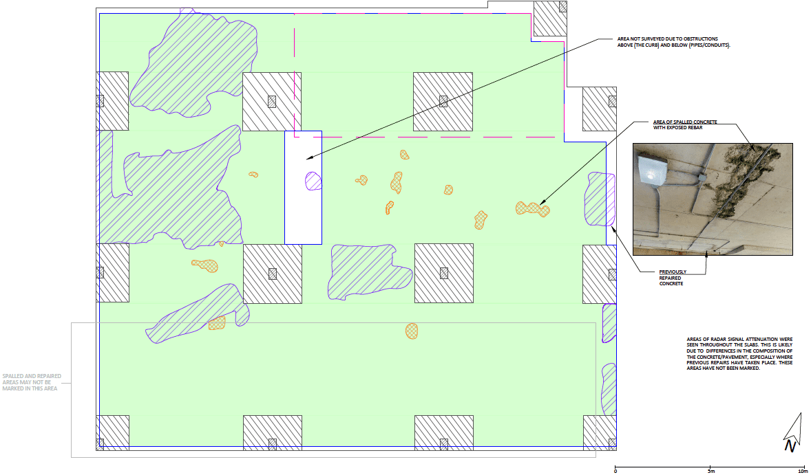 Xradar was hired to provide a corrosion analysis of a large two level parking garage. The client was concerned about two specific areas that had noticeable signs of spalled concrete. These areas were 600m² and 525m² respectively.